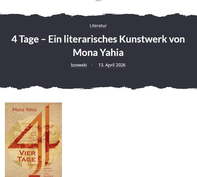 Margret Iversen schrieb uns am 10.02.2026Thema: Mona Yahia: Vier Tage Rezension auf: literaturkritik.de Wer Welthaftigkeit in zeitgenössischer Literatur erwartet, muss diesen Roman lesen.„Das Ziel des Schreibens ist es, andere sehen zu lassen“, sagt…
