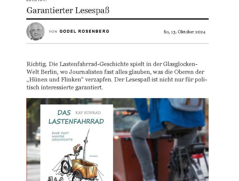 Tichys Einblick, 13. Oktober 2024, Godel Rosenberg Richtig. Die Lastenfahrrad-Geschichte spielt in der Glasglocken-Welt Berlin,…