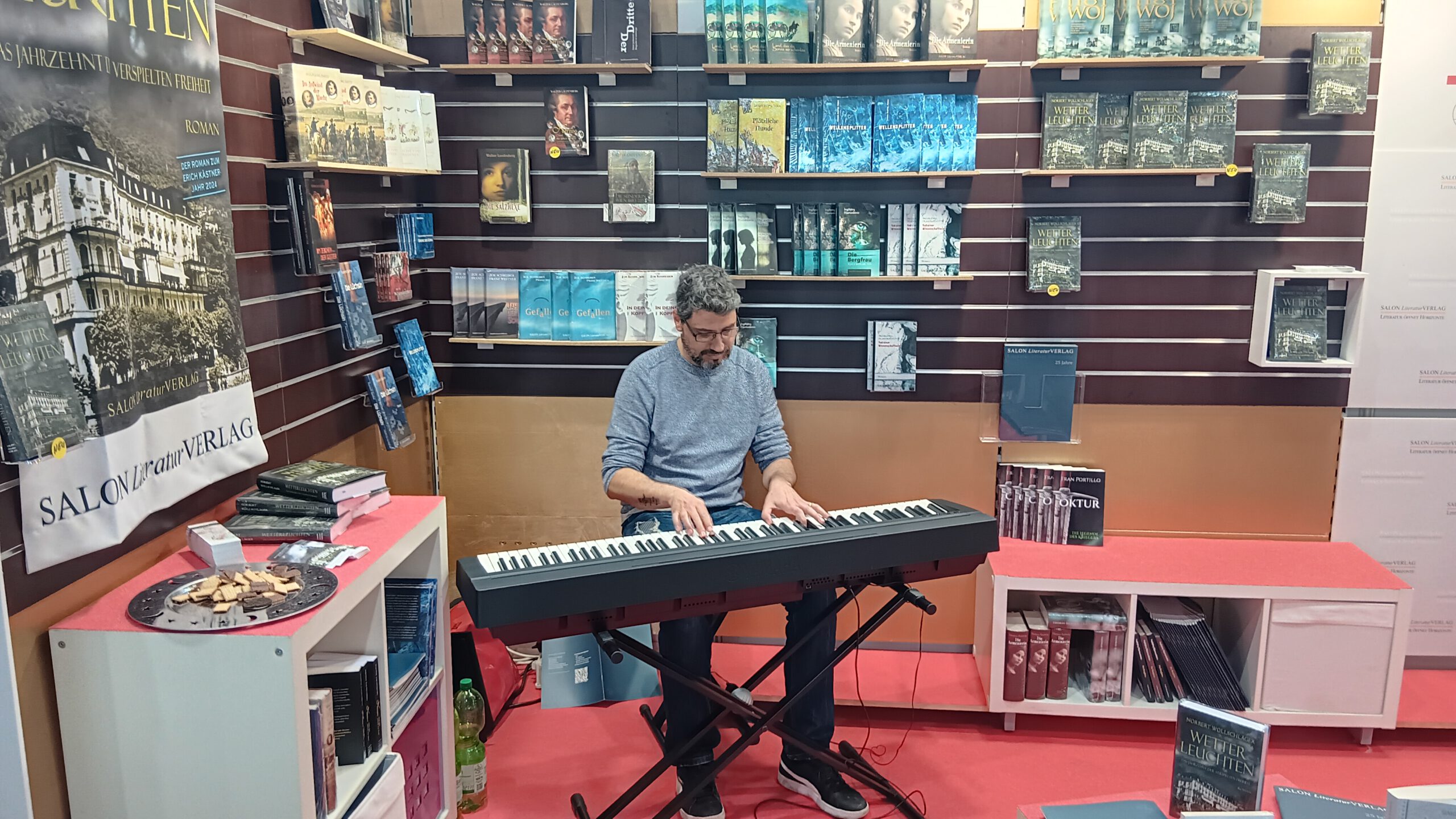 Chef-Promoter Simon Gerhol mit unserem fantastischen SALON-Pianisten Fran Portillo, dazu die immer gut gelaunte Ruth Neureiter (FDA-Bayern), am Samstag und Sonntag zusätzlich auch die wunderbare Jannette Hofmann, und nicht zu vergessen die unermüdlich freundliche und hilfsbereite Übersetzerin Sandra Hubmann, die all die Tage unseren Roman für die Buchmesse Frankfurt “Endstation Hoffnung” des italienischen Erfolgsautors Andrea Frediani promotete.