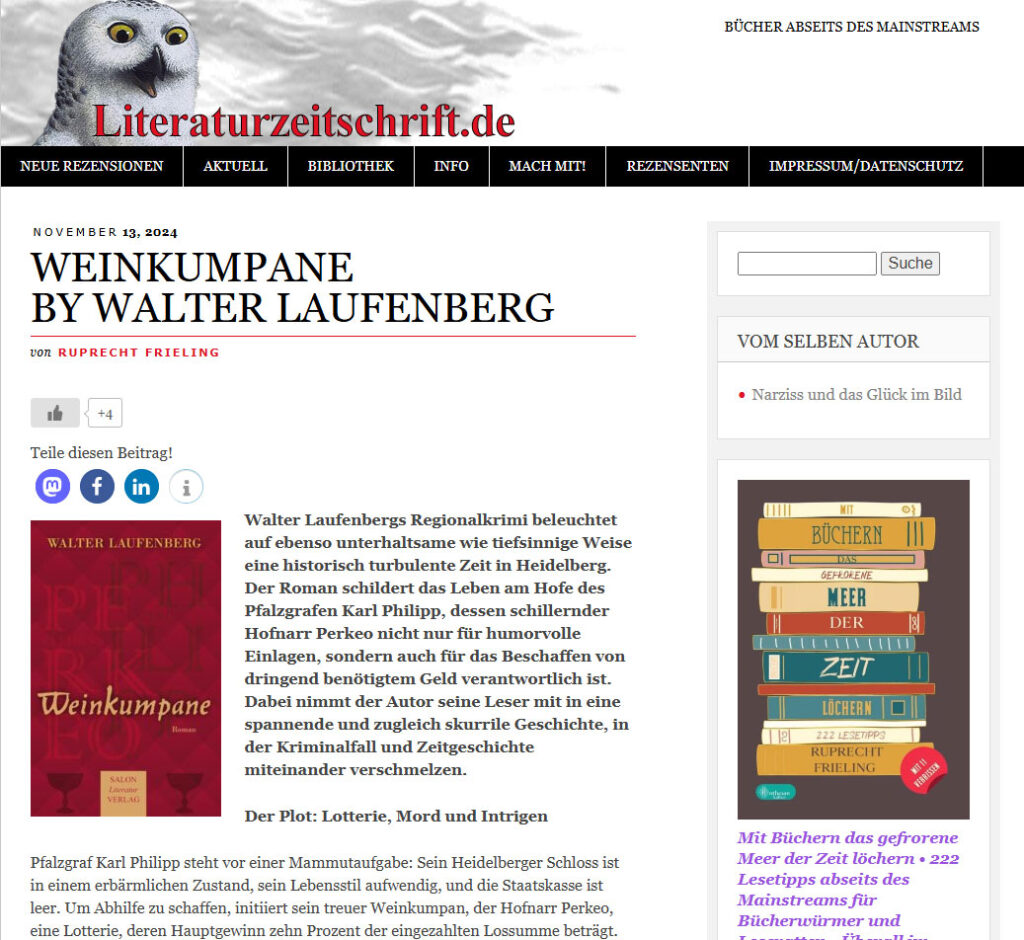 13. November 2023, https://literaturzeitschrift.de/book-review/weinkumpane/, Ruprecht Frieling Walter Laufenbergs Regionalkrimi beleuchtet auf ebenso unterhaltsame wie tiefsinnige Weise eine historisch turbulente Zeit in Heidelberg. Der…